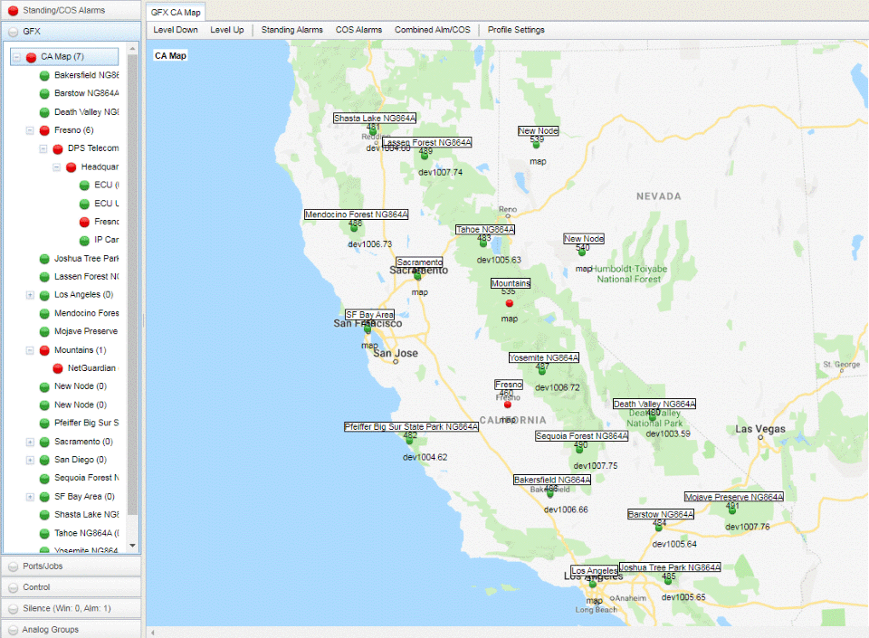 - T/Mon GFX graphical user interface shows all alarms on layered geographic maps in real-time.